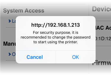 on the upper left, select [Login] to log in. - If you log in with the default password, after starting the printer, the following message will appear when logging in for the first time.