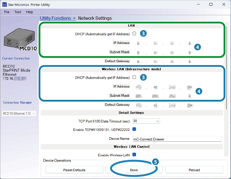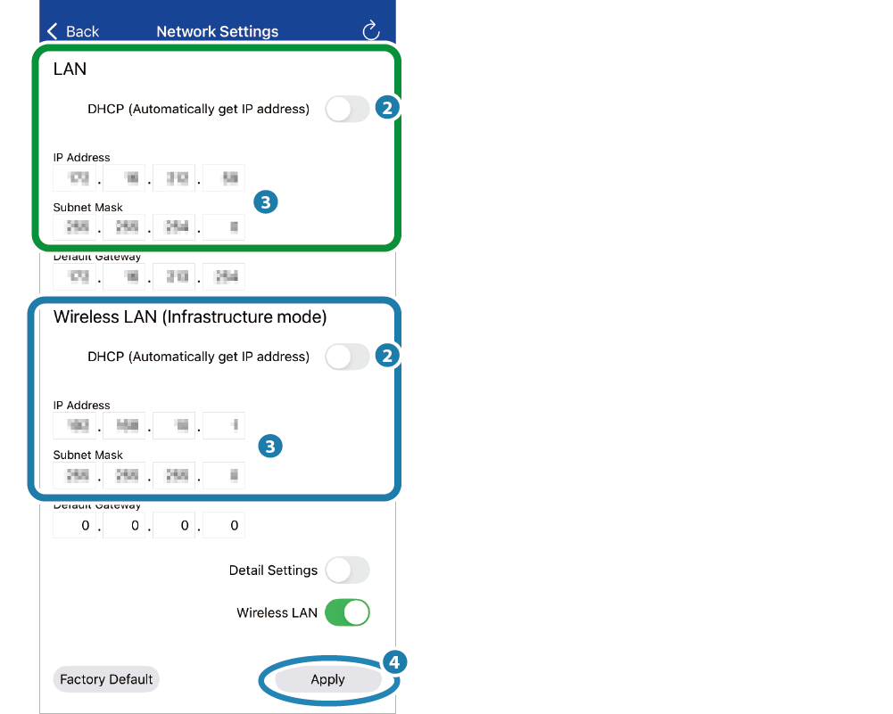 - For wired LAN, configure LAN (in the green box), and for wireless LAN, configure wireless LAN (infrastructure mode) (in the blue box) as shown in the following.