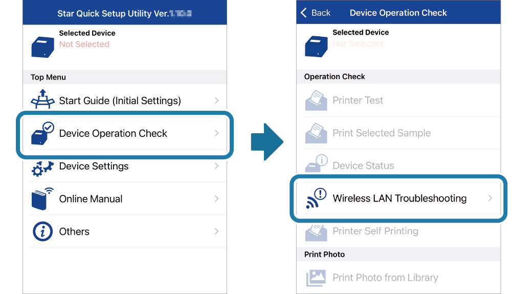 - Start Star Quick Setup Utility. Tap [Device Operation Check]-[Wireless LAN Troubleshooting].