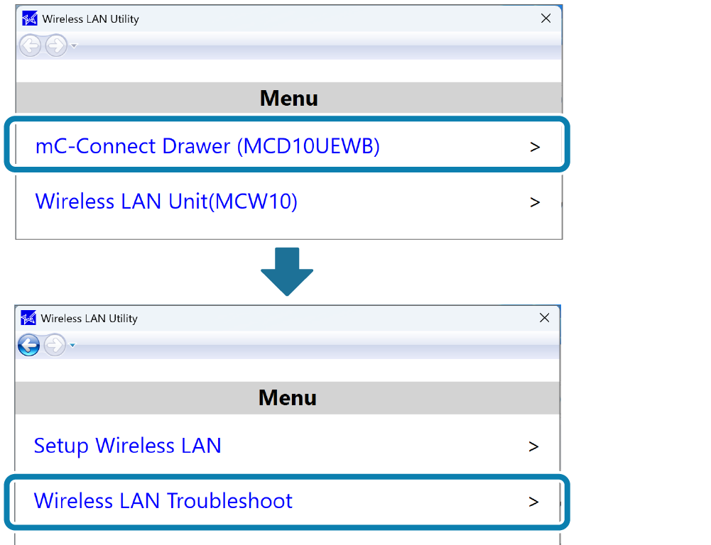 - Click [mC-Connect Drawer (MCD10UEWB)]-[Wireless LAN Troubleshoot].