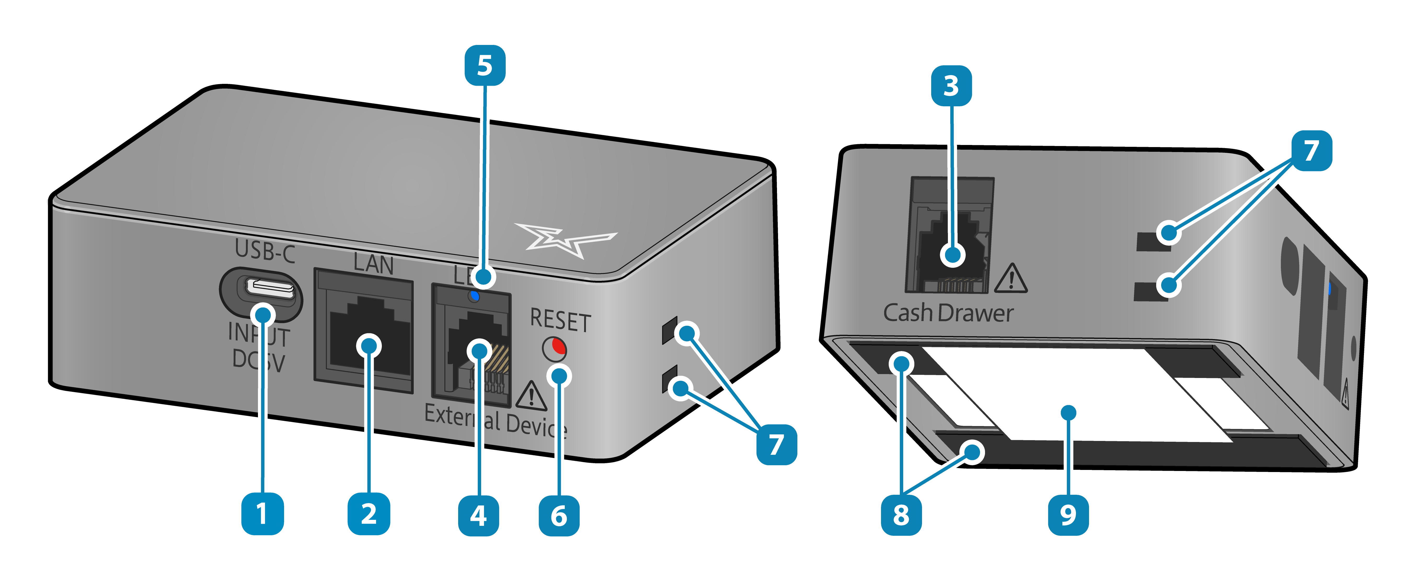 Connect a cash drawer. Prioritize using this port (marked with Cash Drawer) to connect the cash drawer.