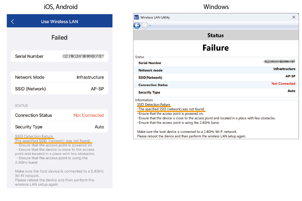 If the dedicated app displays "Failed" during wireless network setup, the connection attempt was unsuccessful.