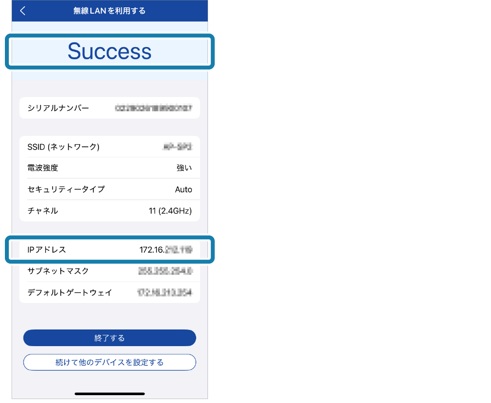 設定が完了すると、アプリに[Success]と表示されます。
