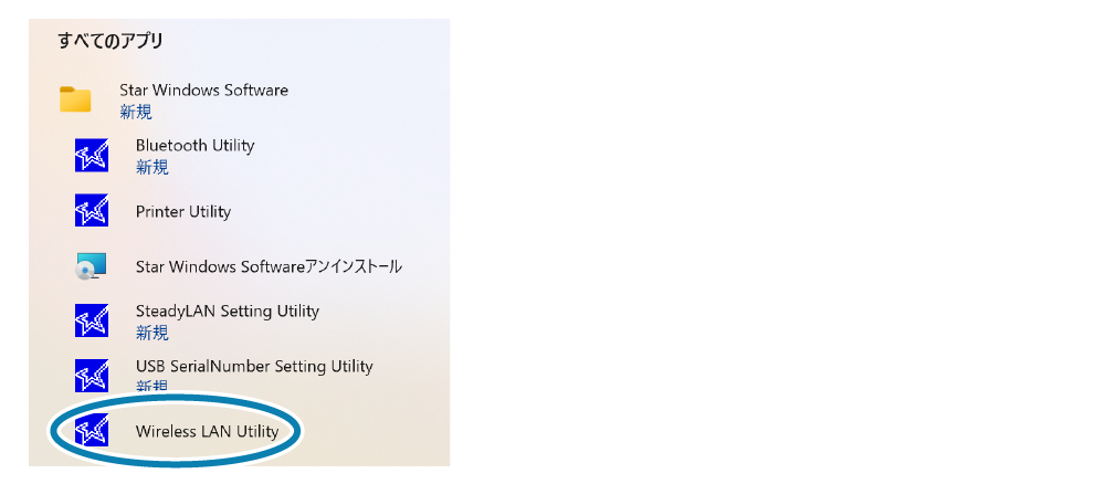 - Windowsのスタートメニューから、[すべてのアプリ]-[Star Windows Software]-[Wireless LAN Utility]を起動します。