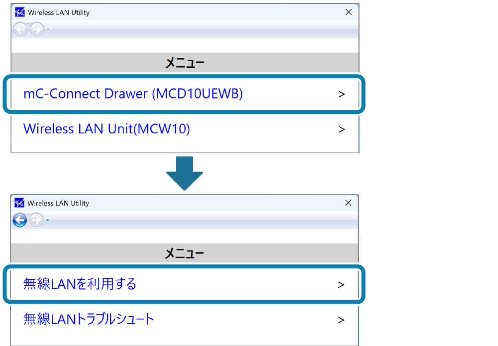 [はじめての方へ(初期設定)] - [無線LANを利用する] を開きます。 - モデルの選択から[MCD10UEWB]を選択します。