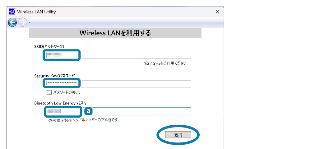 [無線LANを利用する]をクリックします。 - 接続するネットワークのSSID、Security Key、Bluetooth Low Energyのパスキー