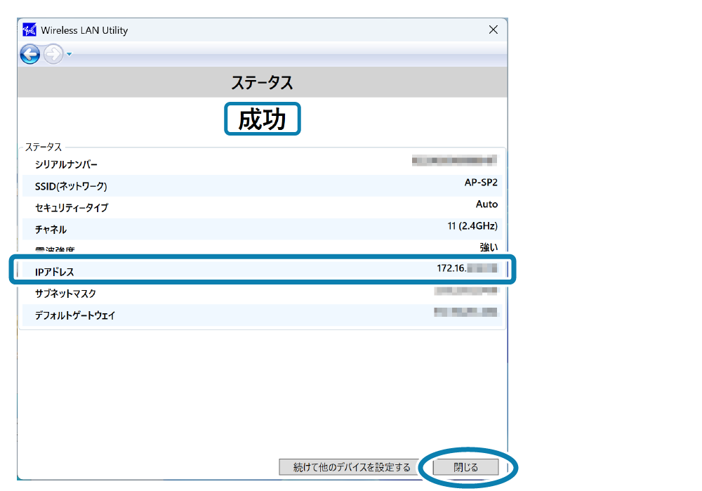 [閉じる]をクリックし、設定完了です。 - 本製品の識別をするためにデバイス名(LAN)の設定、固定IPアドレスの設定ができます。