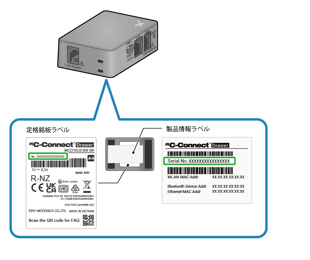 製品情報ラベル、または定格銘板ラベルでご確認できます。下記イラスト緑枠内 16ケタの番号