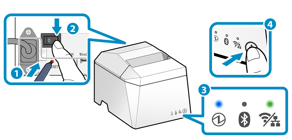 Press and hold the FEED button until the printer resets to complete the initialization.