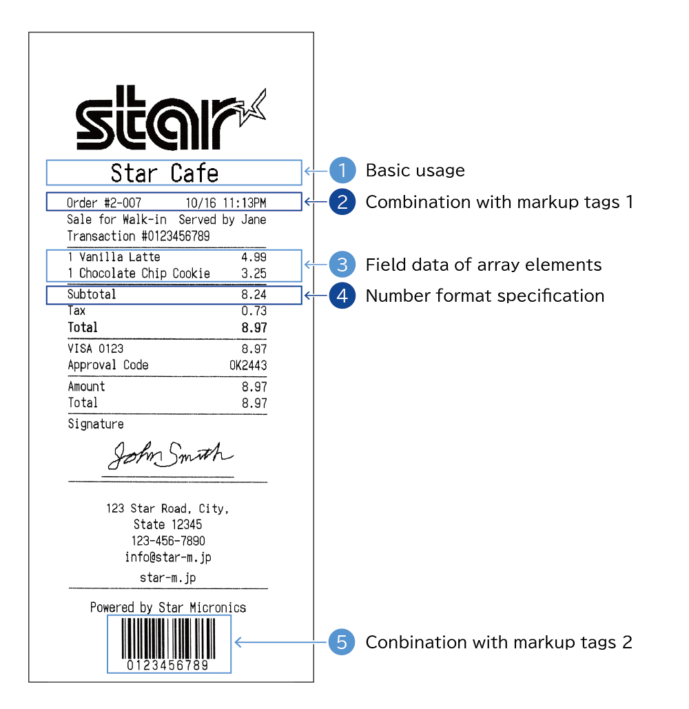 A template is a print layout defined by a combination of fixed printing data and replacing specifiers, created with the Star Document Markup.